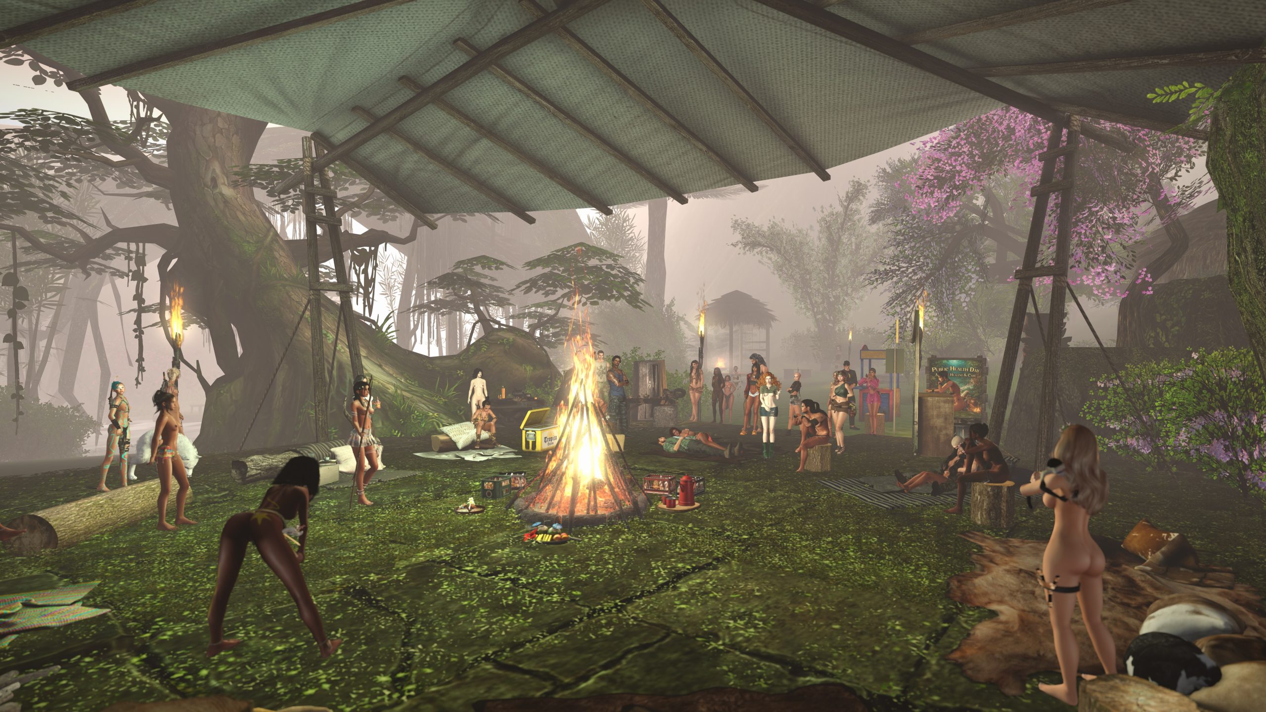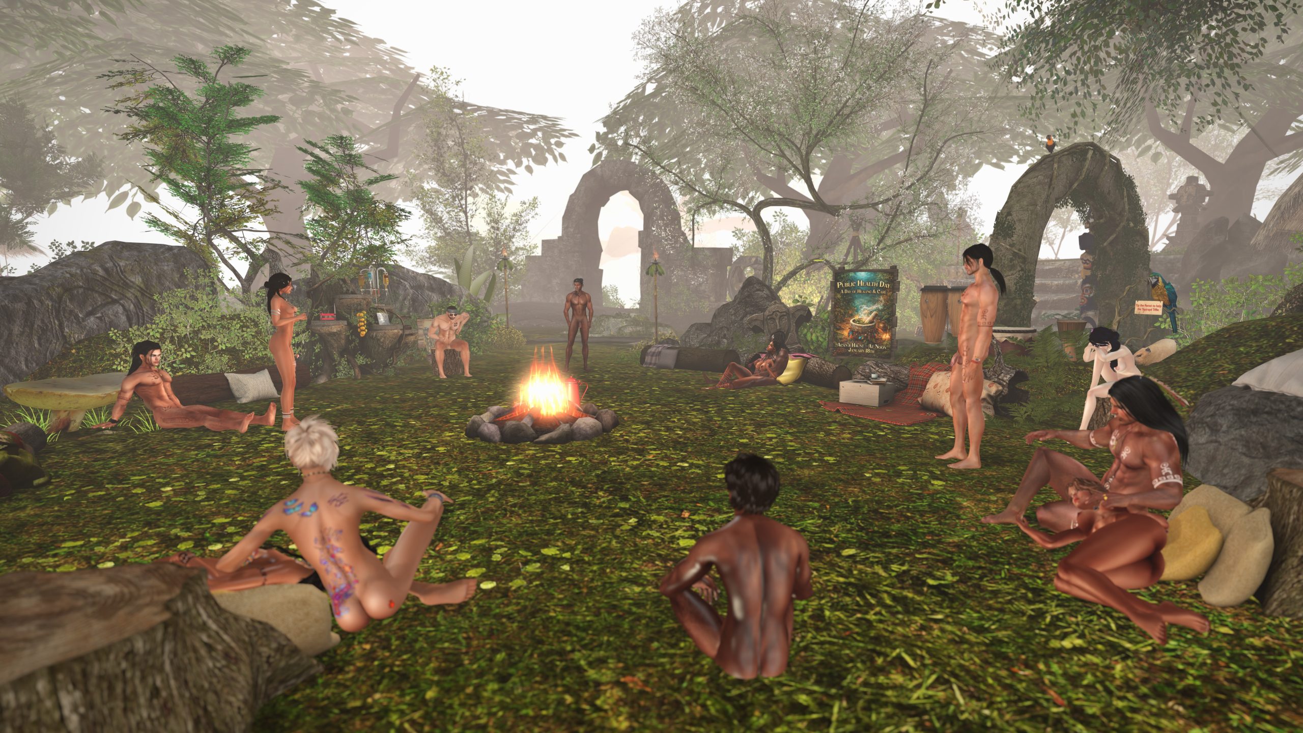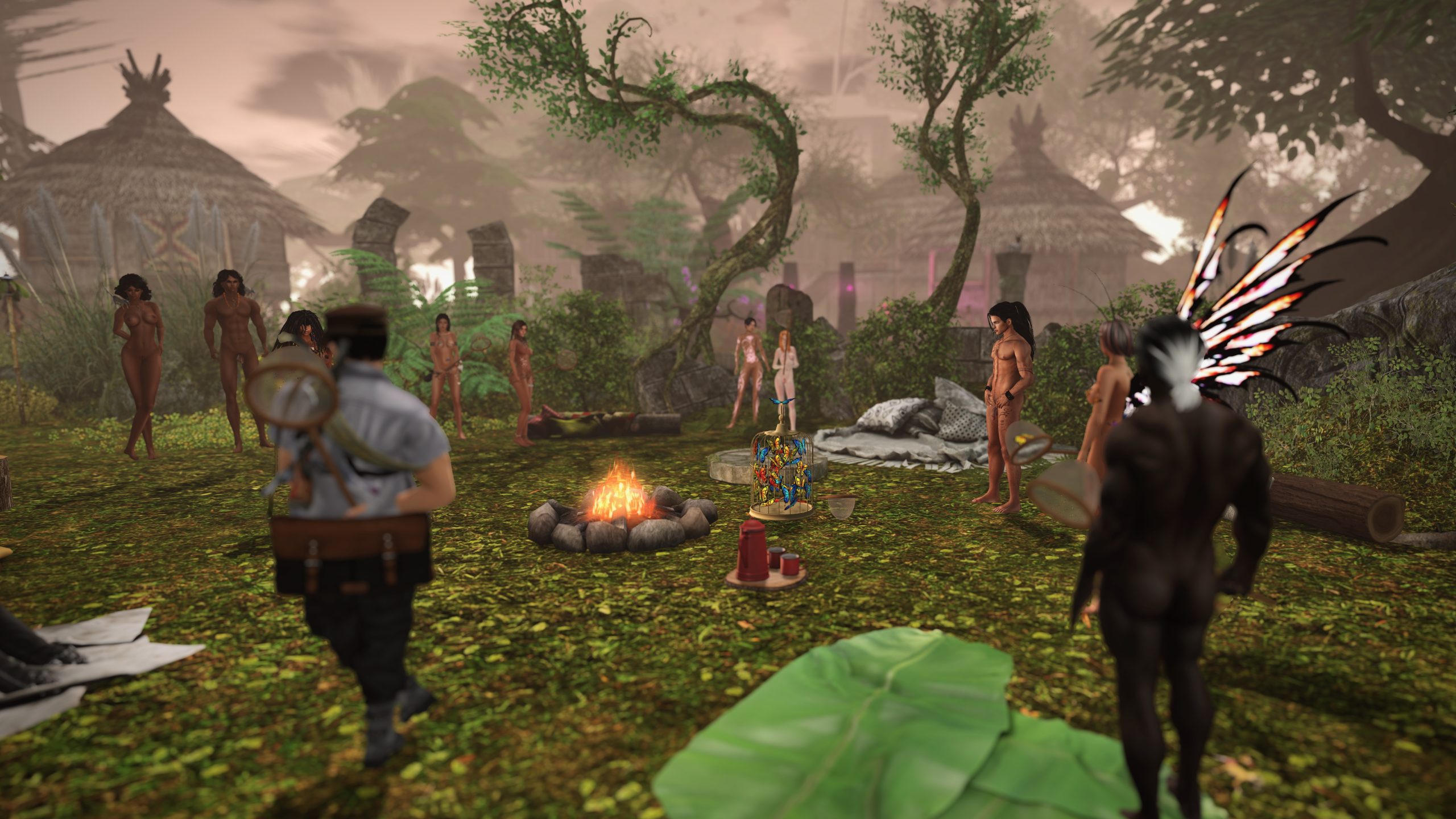 Unclothed villagers gather around a campfire under the jungle canopy at night